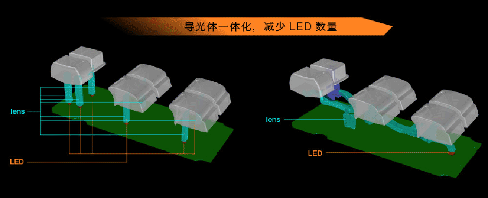通过此导光体,我们可以减少零部件数量,缩短组装时间,此外由于只需安装一个LED光源,也就同时解决了多个LED光源之间的色度差异问题。