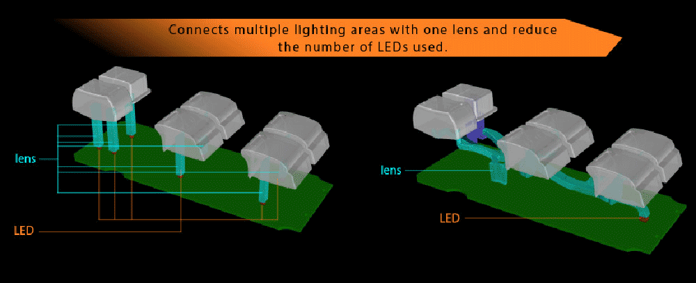 Because of this clever solution, we made it possible to reduce the number of parts used, and the number of assembly processes. Furthermore, because only one LED is used to illuminate the multiple areas, this eliminates the variations of colors.