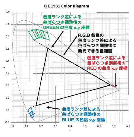 LEDチップ個体毎の色度ばらつきを基板上のLED駆動回路で補正することにより、内装照明全体の色度ばらつきを無くし、統一感のある色調を実現させます。