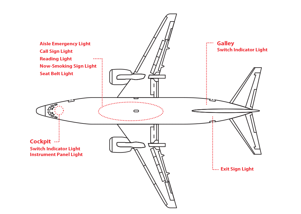 押野電気製作所のランプは、国内外の主要な航空機メーカーに長年にわたり採用されています。航空機向けの厳しい基準をクリアし、アメリカ政府認定の指定部品として、航空機用計器パネルをはじめ、内外装向けの多彩なランプを提供し続けています。飛行機の安全運行と乗客の快適な空の旅を支えています。