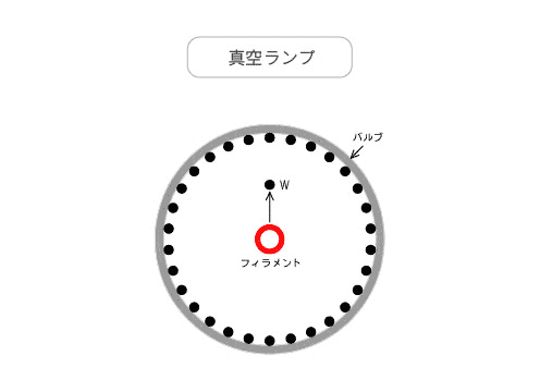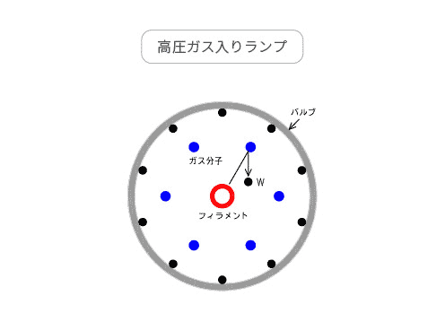 フィラメントから蒸発したタングステン(W)はガス分子に衝突し、蒸発が抑制されます。その結果、バルブ黒化が低減し、光束の低下が少なくなります。また、タングステンの蒸発が少なくなるため寿命は長くなります。