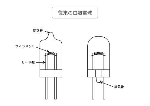 従来、電球に備わっている排気菅は、ランプの内部を真空にしたり、希ガスを封入するための細い管です。
